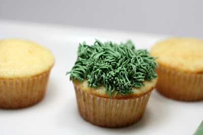 Use your favorite cupcake recipe. Chocolate cupcakes would be awesome too! In retrospect, chocolate probably would've been better, huh? hehe. Oh, well. Maybe next time. And use whatever frosting you like! What about cute liners? Maybe green polka-dotted ones! My point is: you can get super creative with these! Go wild!